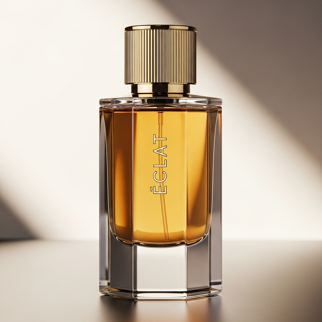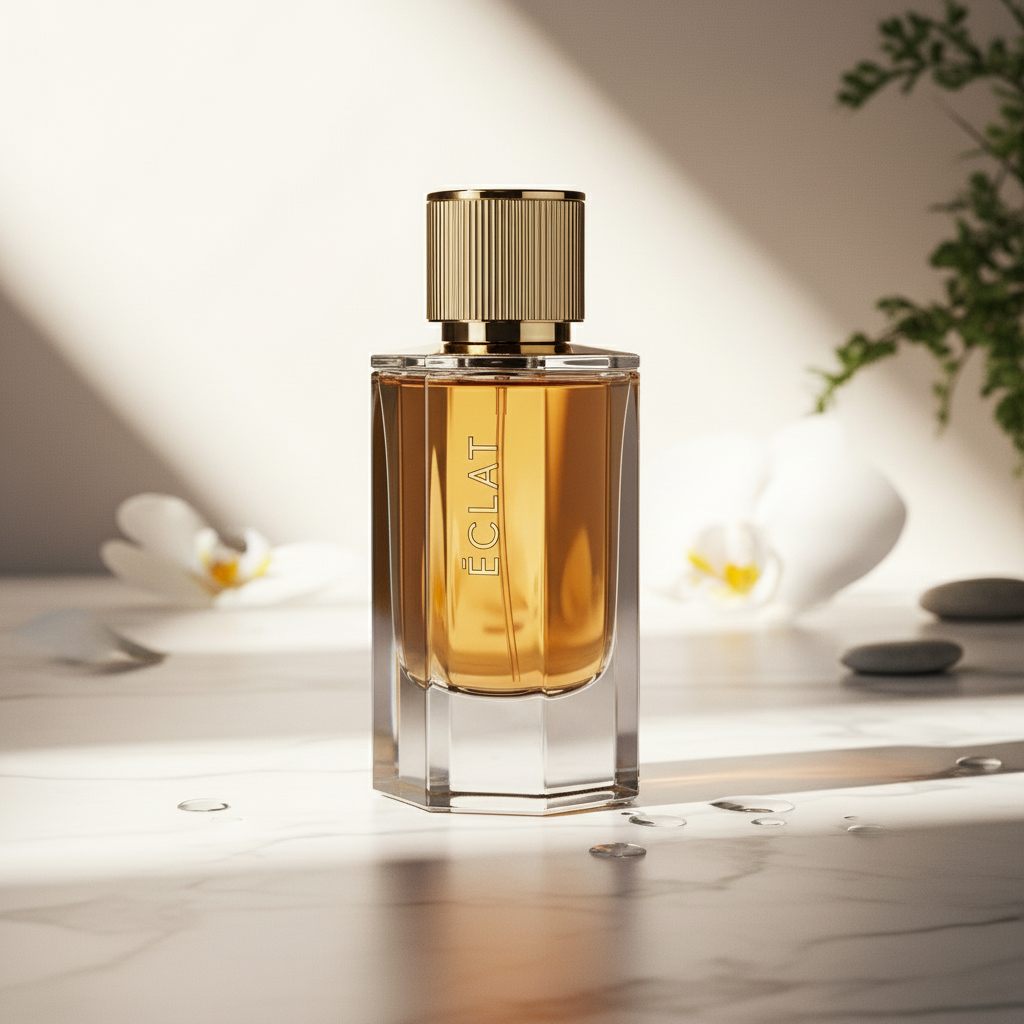 “A luxury perfume bottle on a marble countertop with soft sunlight.”